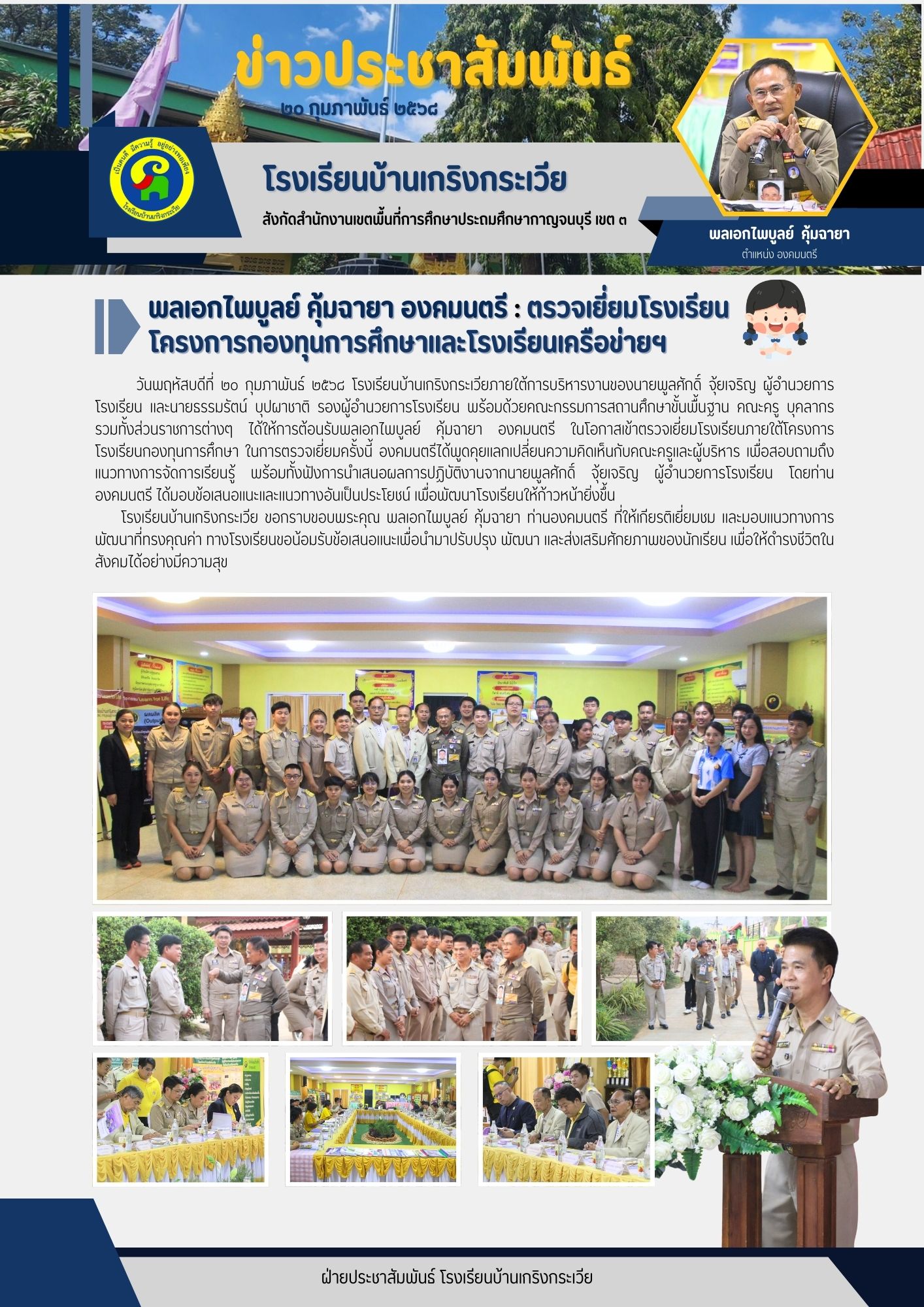 เมื่อวันจันทร์ที่ 19 กุมภาพันธ์ 2568 พลเอกไพบูลย์ คุ้มฉายา องคมนตรี ได้เดินทางมาตรวจเยี่ยมโรงเรียนบ้านเกริงกระเวีย เพื่อติดตามความคืบหน้าของโครงการกองทุนการศึกษาและโรงเรียนเครือข่ายฯ ในโอกาสนี้ได้พบปะคณะผู้บริหาร คณะครู และบุคลากรทางการศึกษา พร้อมให้คำแนะนำแนวทางการพัฒนาโรงเรียน