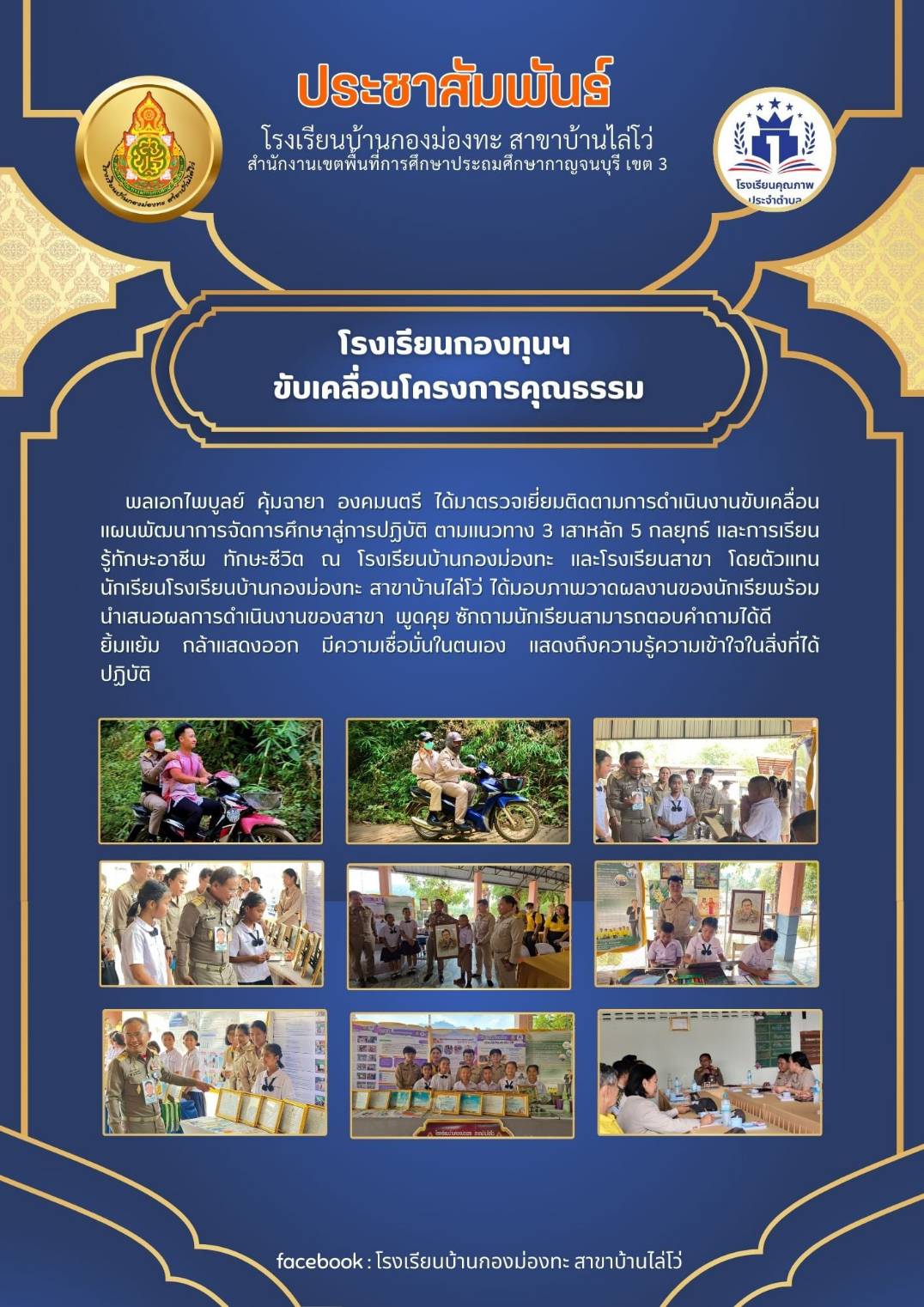 พลเอกไพบูลย์ คุ้มฉายา องคมนตรี ได้ตรวจเยี่ยมการดำเนินงานของโรงเรียนบ้านกองม่องทะ และโรงเรียนสาขาบ้านไล่โว่ เพื่อติดตามความก้าวหน้าของแผนพัฒนาการจัดการศึกษา โดยเน้นการเรียนรู้ทักษะอาชีพ ทักษะชีวิต และหลักคุณธรรม 5 กลยุทธ์