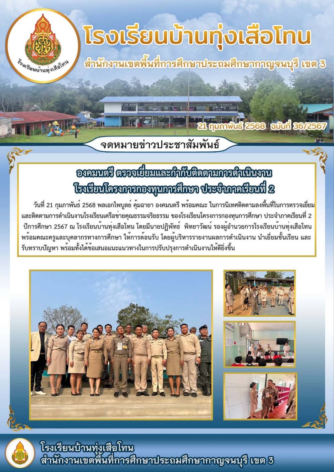 วันที่ 21 กุมภาพันธ์ 2568 พลเอกไพบูลย์ คุ้มฉายา องคมนตรี พร้อมคณะ ในการนิเทศติดตามลงพื้นที่ในการตรวจเยี่ยม และติดตามการดำเนินงานโรงเรียนเครือข่ายคุณธรรมจริยธรรม ของโรงเรียนโครงการกองทุนการศึกษา ประจำภาคเรียนที่ 2 ปีการศึกษา 2567 ณ โรงเรียนบ้านทุ่งเสือโทน