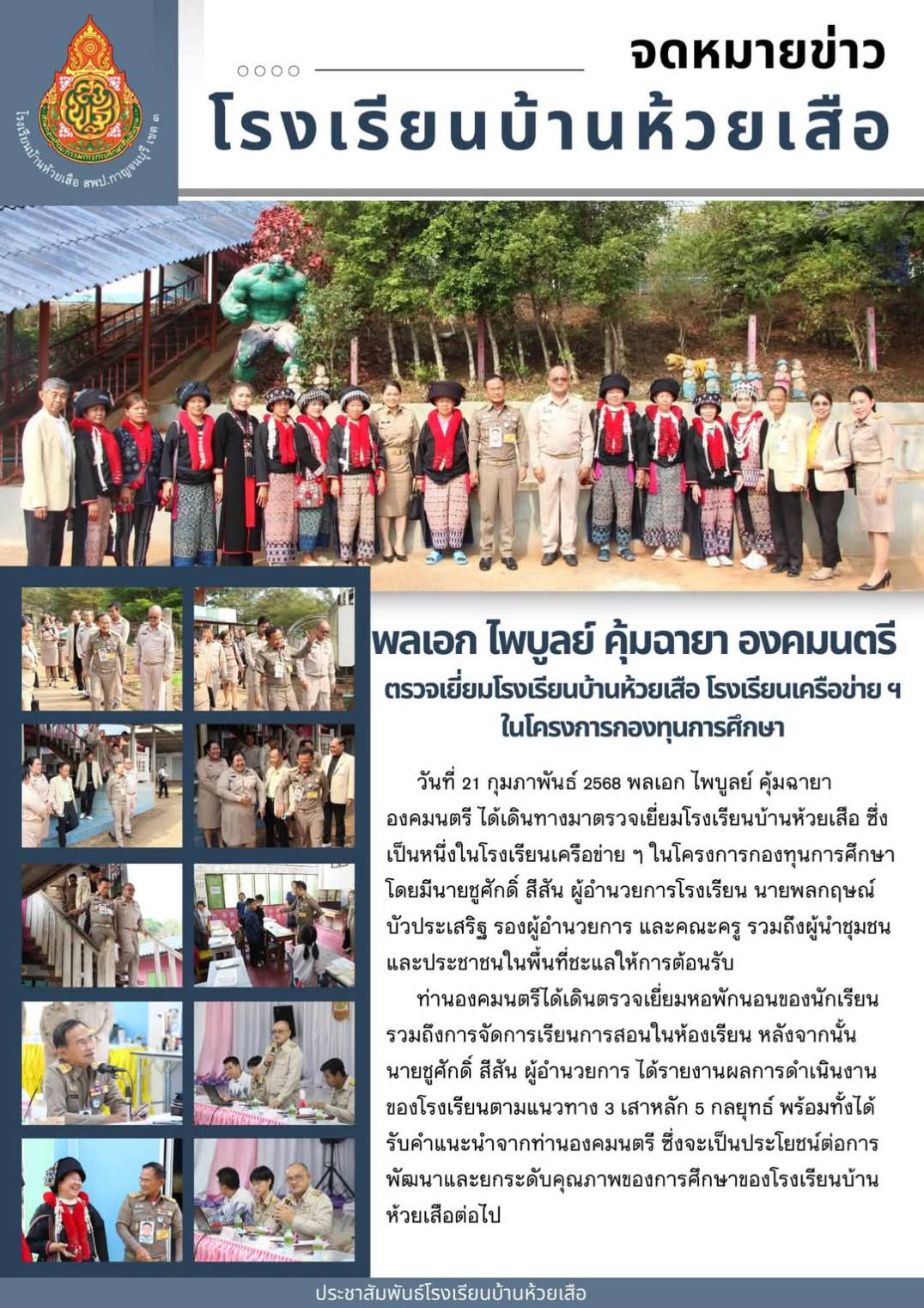 วันที่ 21 กุมภาพันธ์ 2568 พลเอก ไพบูลย์ คุ้มฉายา องคมนตรี ได้เดินทางมาตรวจเยี่ยมโรงเรียนบ้านห้วยเสือ ซึ่ง เป็นหนีอในโรธเรียนเครือข่าย ฯ ในโครธการกองทุนการศึกษา โดยมีนายชูศักดิ์ สีสัน ผู้อำนวยการโรธเรียน นายพลกฤษณ์ บัวประเสริฐ รองผู้อำนวยการ และคณะครู รวมถึงมถึงชุมชมชน และประชาชนในพื้นที่ชะแลให้การต้อนรับ