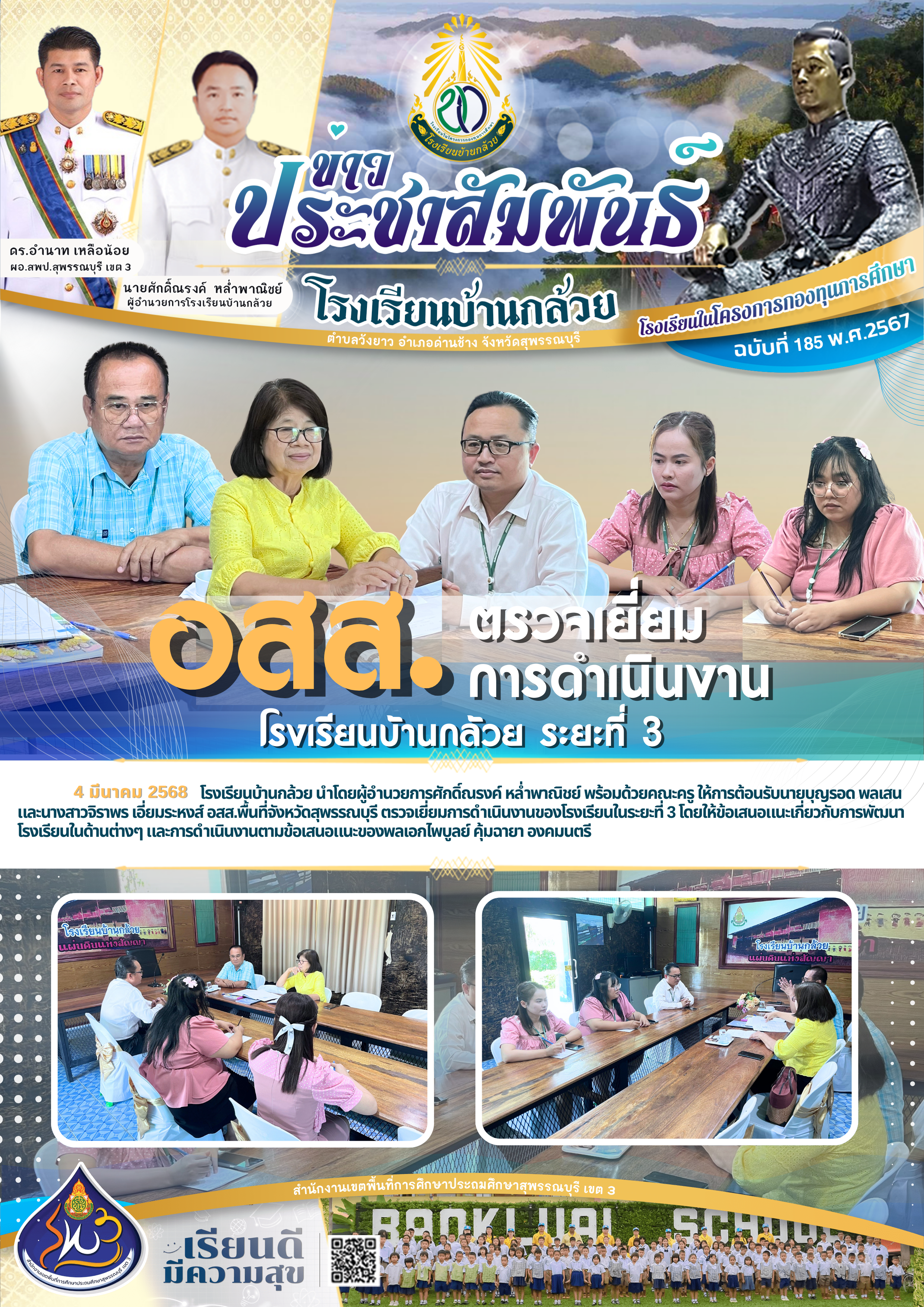 เมื่อวันที่ 4 มีนาคม 2568 โรงเรียนบ้านกล้วยให้การต้อนรับ นายบุญรอด พลเสน และ นางสาวจีราพร เอี่ยมระหงษ์ อสส. พื้นที่จังหวัดสุพรรณบุรี ในการตรวจเยี่ยมและติดตามการดำเนินงานของโรงเรียนในโครงการกองทุนการศึกษาระยะที่ 3 โดยได้มีการให้ข้อเสนอแนะเกี่ยวกับแนวทางพัฒนาโรงเรียน พร้อมทั้งติดตามข้อมูลและนโยบายของ พลเอกไพบูลย์ คุ้มฉายา องคมนตรี เพื่อพัฒนาคุณภาพการศึกษาอย่างต่อเนื่อง
