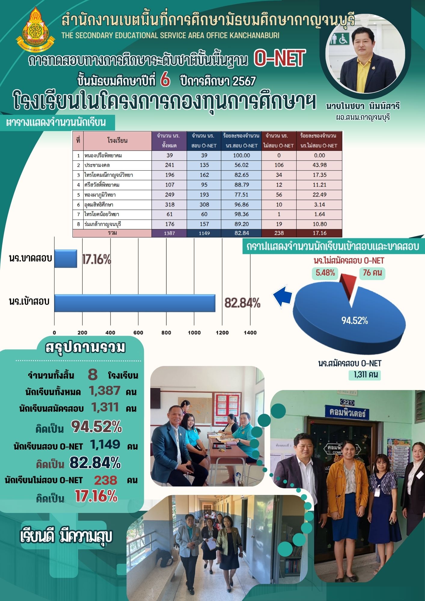 นายไพชยา พิมพ์สารี ผอ.สพม.กาญจนบุรี ลงพื้นทีตรวจเยียมการสอบ O-net ชั้นมัธยมศึกษาปีที่ 6 ในพื้นที่โรงเรียนกองทุนการศึกษา