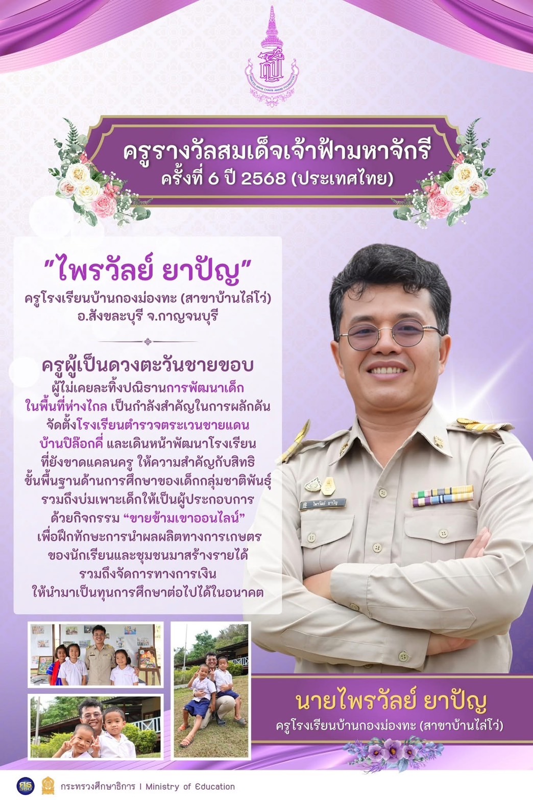 ครูโรงเรียนบ้านกองม่องทะ (สาขาบ้านโล่โว่) อ.สังขละบุรี จ.กาญจนบุรี เป็นครูผู้เสียสละ ทุ่มเทพัฒนาเด็กในพื้นที่ชายขอบอย่างไม่ย่อท้อ ได้คว้ารางวัลสมเด็จเจ้าฟ้ามหาจักรี ครั้งที่ 6 ปี 2568 (ประเทศไทย)