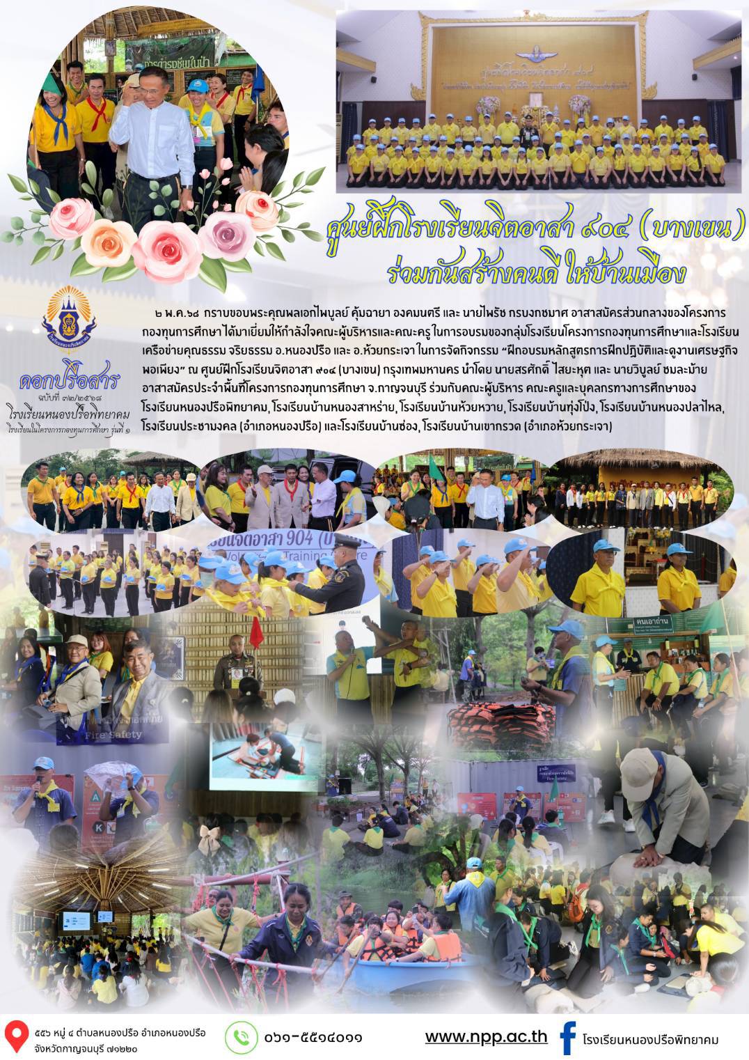วันที่ 6 พฤษภาคม 2568 โรงเรียนหนองปรือพิทยาคม จังหวัดกาญจนบุรี นำโดยผู้บริหาร คณะครู และนักเรียน เข้าร่วมกิจกรรมที่ศูนย์ฝึกโรงเรียนจิตอาสา 904 (บางเขน) ภายใต้โครงการสร้างความรักความสามัคคีของคนในชาติ “เราทำความดีด้วยหัวใจ” โดยได้รับเกียรติจาก พลเอก ไพบูลย์ คุ้มฉายา องคมนตรี และ นายไพโรจน์ กรนราเขษ จากสำนักงานจิตอาสาพระราชทาน ให้คำแนะนำและมอบกำลังใจแก่ผู้เข้าร่วมกิจกรรม