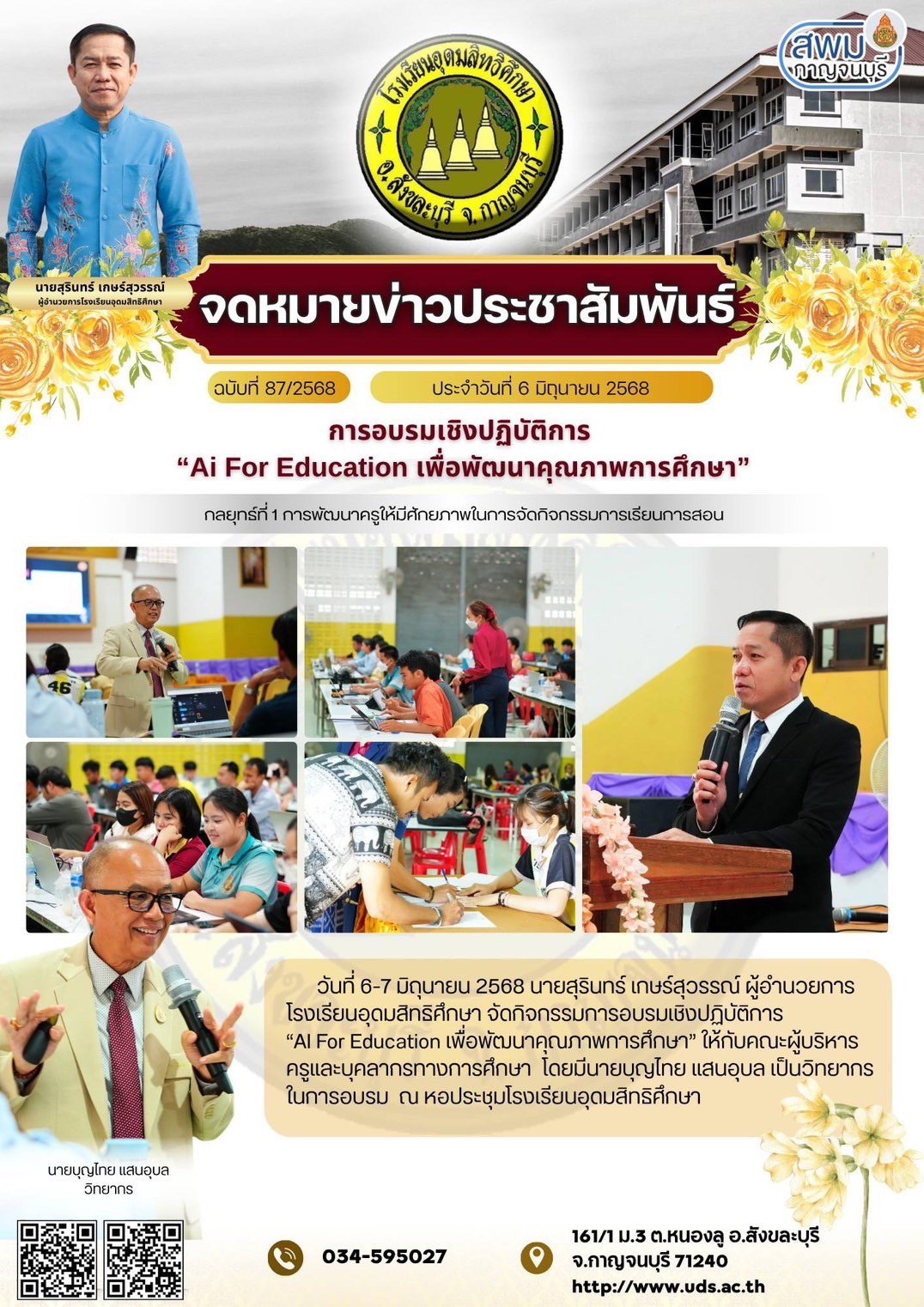 นายสุรินทร์ เกษร์สุวรรณ์ ผู้อำนวยการโรงเรียนอุดมสิทธิ์ศึกษา จัดการอบรมเชิงปฏิบัติการ Ai for Education เพื่อพัตนาคุณภาพการศึกษา ให้กับคณะผู้บริหาร ครู และบุคลากรทางการศึกษา