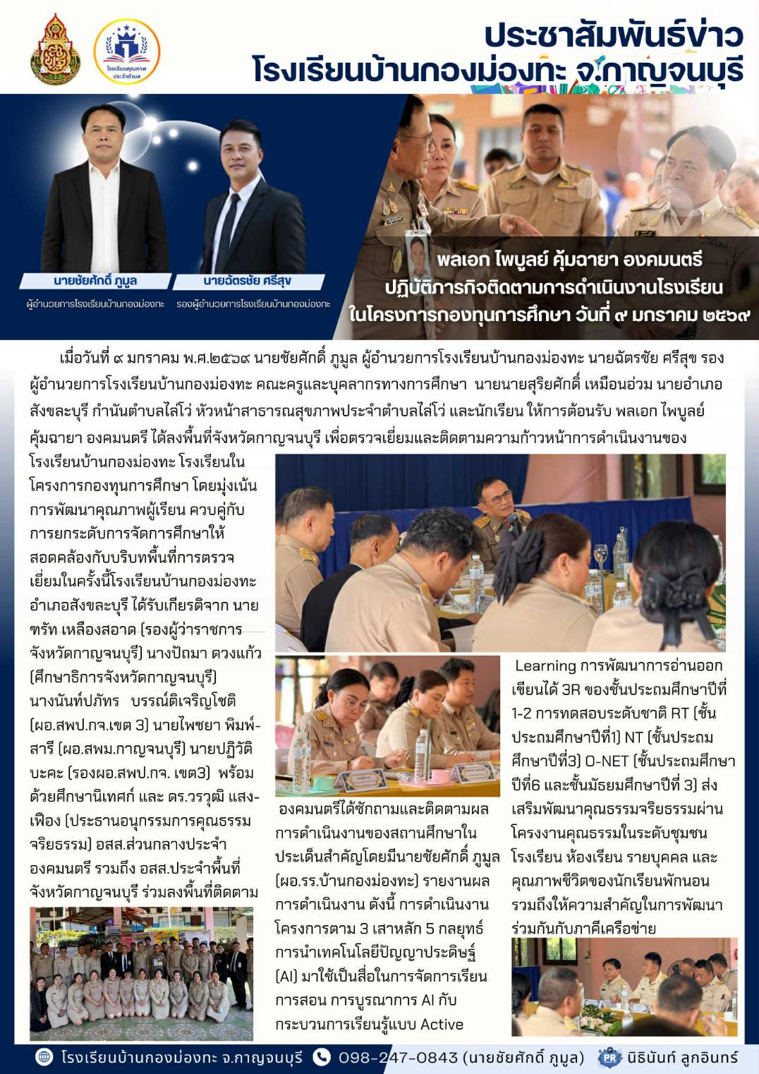 วันที่ (7–9 มกราคม 2569) พลเอก ไพบูลย์ คุ้มฉายา องคมนตรี ได้ลงพื้นที่จังหวัดกาญจนบุรี เพื่อตรวจเยี่ยมและติดตามความก้าวหน้าการดำเนินงานของสถานศึกษาในโครงการกองทุนการศึกษา โดยมุ่งเน้นการพัฒนาคุณภาพผู้เรียน ควบคู่กับการยกระดับการจัดการศึกษาให้สอดคล้องกับบริบทพื้นที่